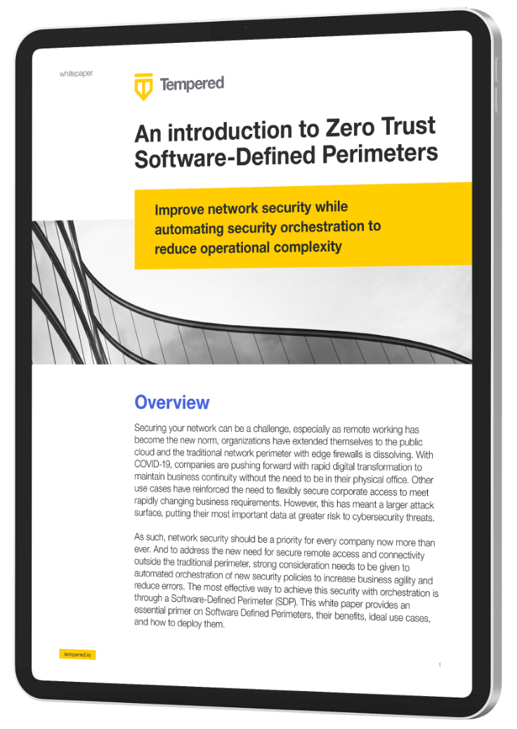 A Software Defined Perimeter uses a zero trust approach to create a more dynamic private network for remote access to any set of devices across any network. Policies are easily managed and aligned with device or user identities. Compared to existing remote access of VPN solutions, Tempered Airwall provides an end-to-end encrypted overlay network to ensure not only secure remote access without chance for broader network access, but eliminated man-in-the-middle attacks or spoofed credentials.